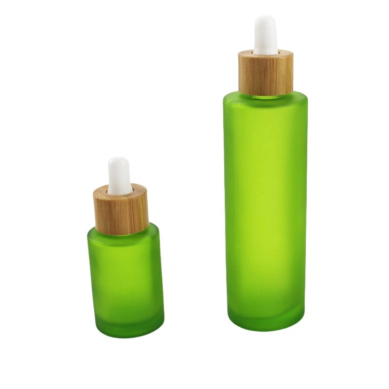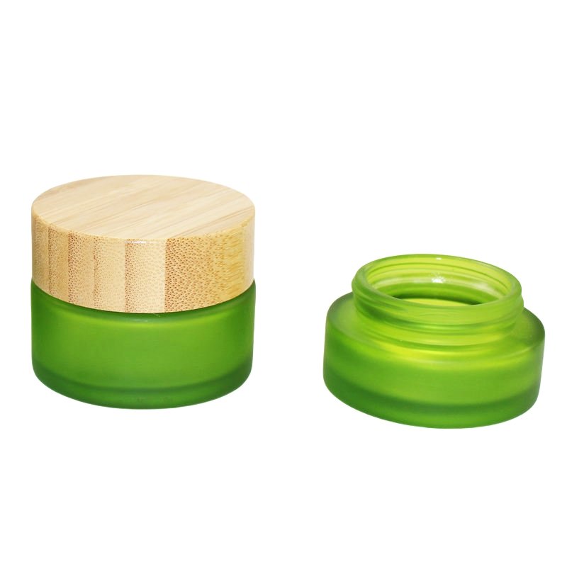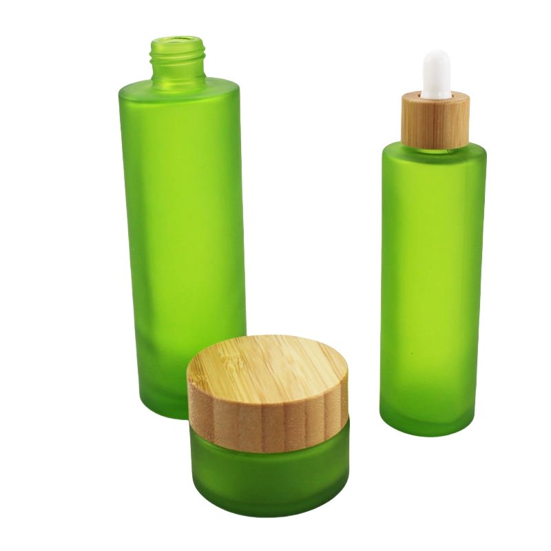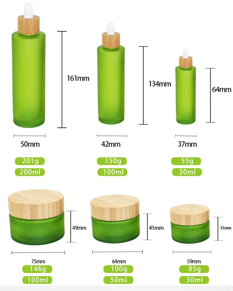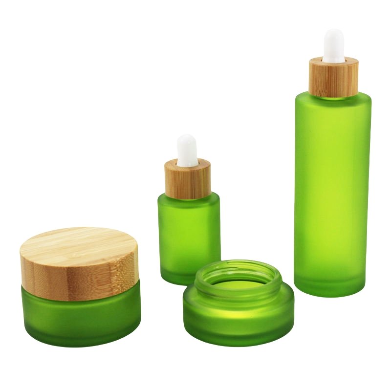 Product Name: For sale glass cosmetic packaging sets green frosted glass bottle for lotion essential oil with bamboo lid cream jar